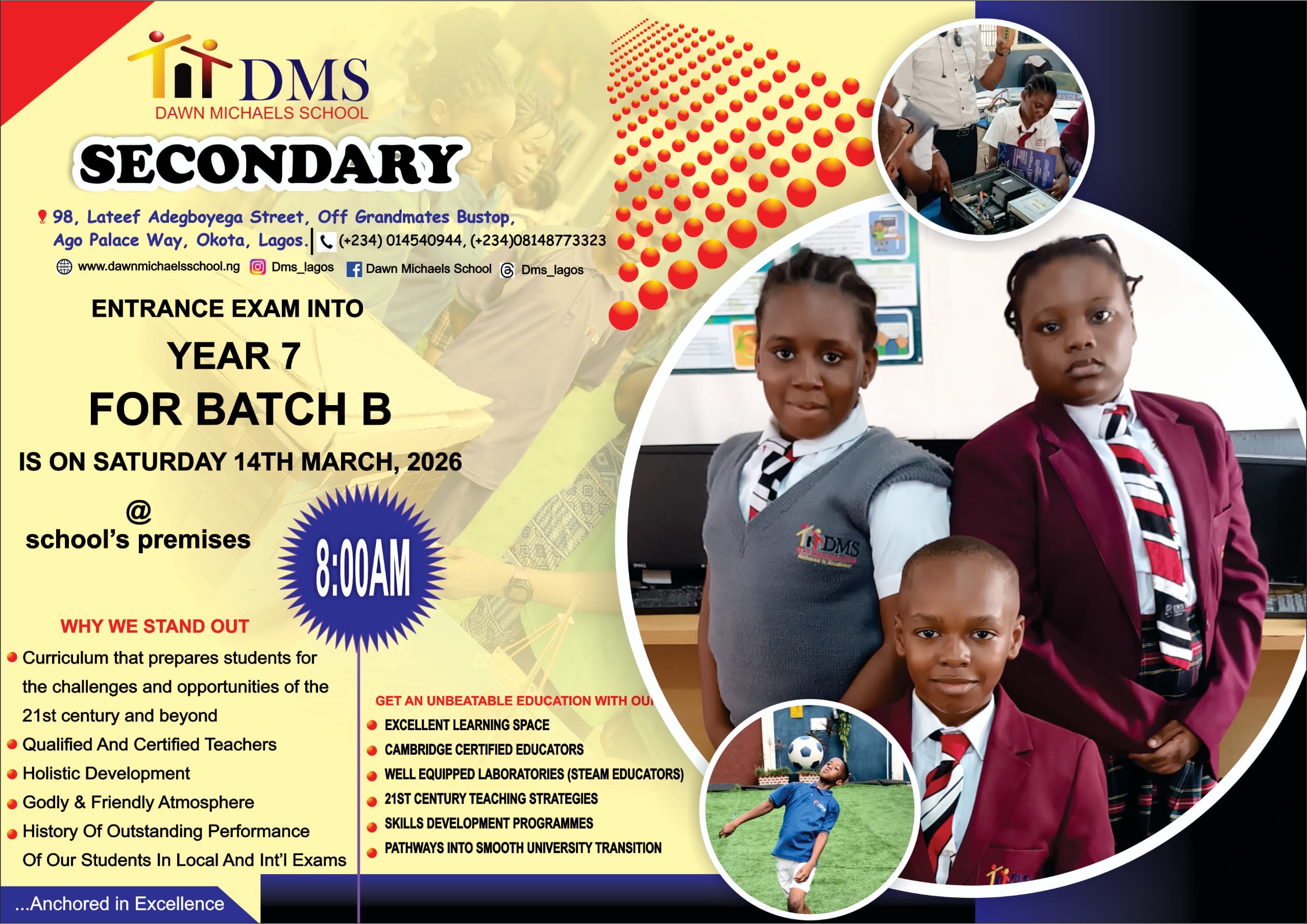 DMS Premises 98 Lateef Adegboyega street, Ago Palace Way, OkotaDawn Michaels School (DMS) invites prospective students and parents to the Secondary School Entrance Examination into Year 7 (Batch B). This examination is designed to …