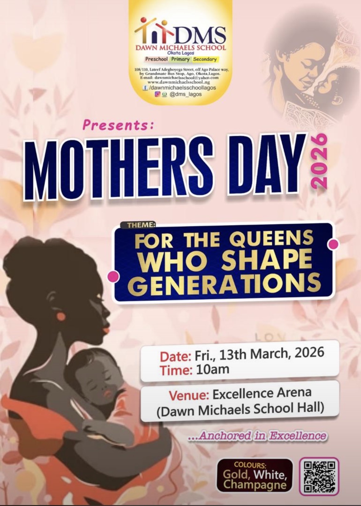 DMS Excellence Arena 98 Lateef Adegboyega Street, Grandmates Bustop, Ago Palace Way, Okota-IsoloDawn Michaels School warmly invites our mothers and mother figures to a special Mother’s Day celebration honoring the love, strength, and guidance they bring into …